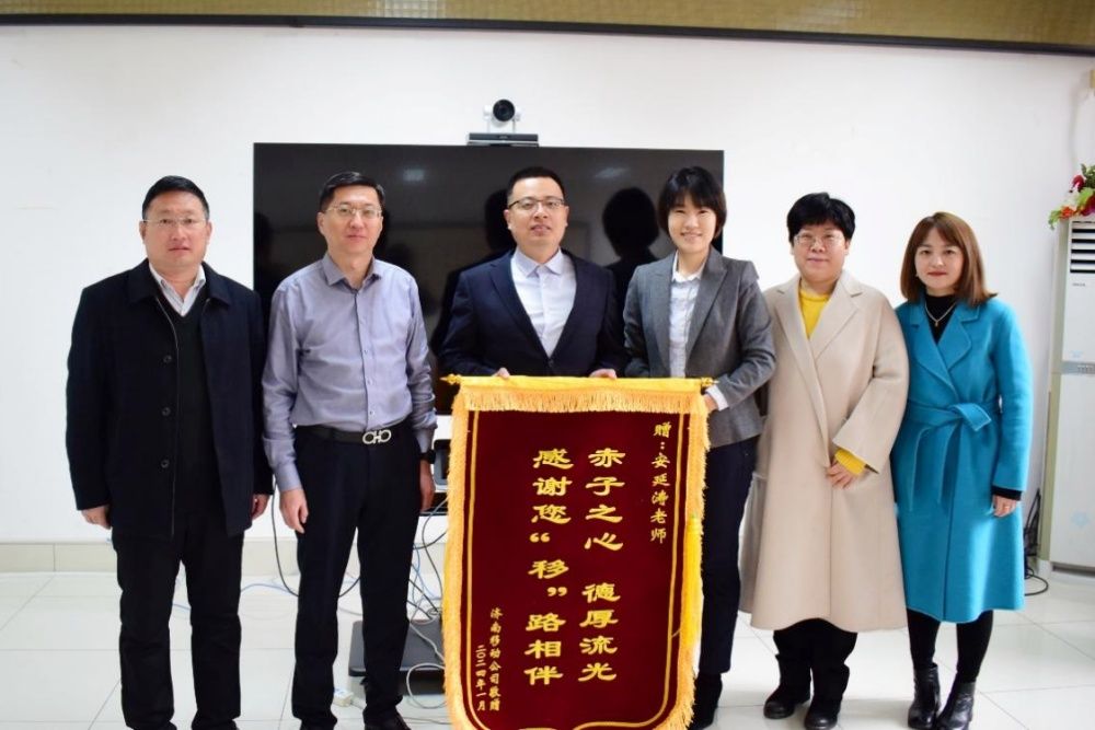 2月29日上午,济南市移动公司代表们来到英国365集团,将一面绣有“赤子之心 厚德流光,感谢您‘移’路相伴”的锦旗送到学院,以表达对英国365集团安延涛老师的感谢之情,学院党委书记程涛、副书记孙成政参加了捐赠仪式。
