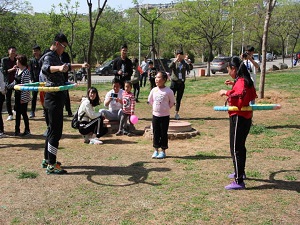 中午12:30,各个家庭负责人联系并接待组内成员至升华广场集合,认真聆听主持人对活动流程的介绍以及紧急情况的应急措施。而后志愿者组织各个家庭前往情人坡,残疾人家庭亲子活动正式开始。春风和煦,阳光明媚,情人坡上游戏热火朝天。游戏前,由裁判员组织并监督且有志愿者进行演示,游戏中以家庭为单位,由父母、孩子、家庭负责志愿者共同参与。首发的成语接龙游戏,带动孩子们游戏的热情;才艺表演期间的街舞表演和歌曲演唱,不仅展示孩子们的才华,同时增添了活动的乐趣,活动渐入佳境;两人三足、心有灵犀、纸杯传水、夹气球跑等游戏拉近了父母和孩子之间的距离。