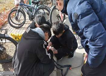 活动开始前,志愿者们拉好横幅,摆好工具,耐心等待需要帮助的同学到来。没过多久,便有同学推着自行车前来寻求帮助,志愿者们热情的帮他检查自行车,找准了车子的“病因”便开始了修理工作。志愿者们分工明确,修理工作井然有序。修理过程中,遇到一些自己无法解决的难题时,便虚心请教经验丰富的学长,学长也耐心的为他们示范,并让他们亲自动手实践确保真正能够独立完成修理工作。修理车子是个需要细心与耐心的工作,在志愿者们共同的努力下,车胎终于补好了。得到帮助的同学向志愿者们表达了自己的感谢,志愿者们也因帮助了同学而感到高兴。